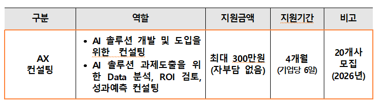 이 사업을 통해 AI컨설팅 수혜기업을 지원하기 위하여「2026년 경남 제조 특화 AI 컨설팅 사업」을 아래와 같이 공고하오니 많은 참여 바랍니다.