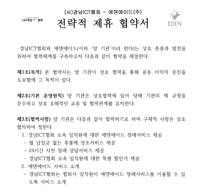 (사)경남ICT협회는 상조스타트업인 에덴에이드와 MOU 를 체결하고 회원사에 혜택을 제공하기로 하였습니다.