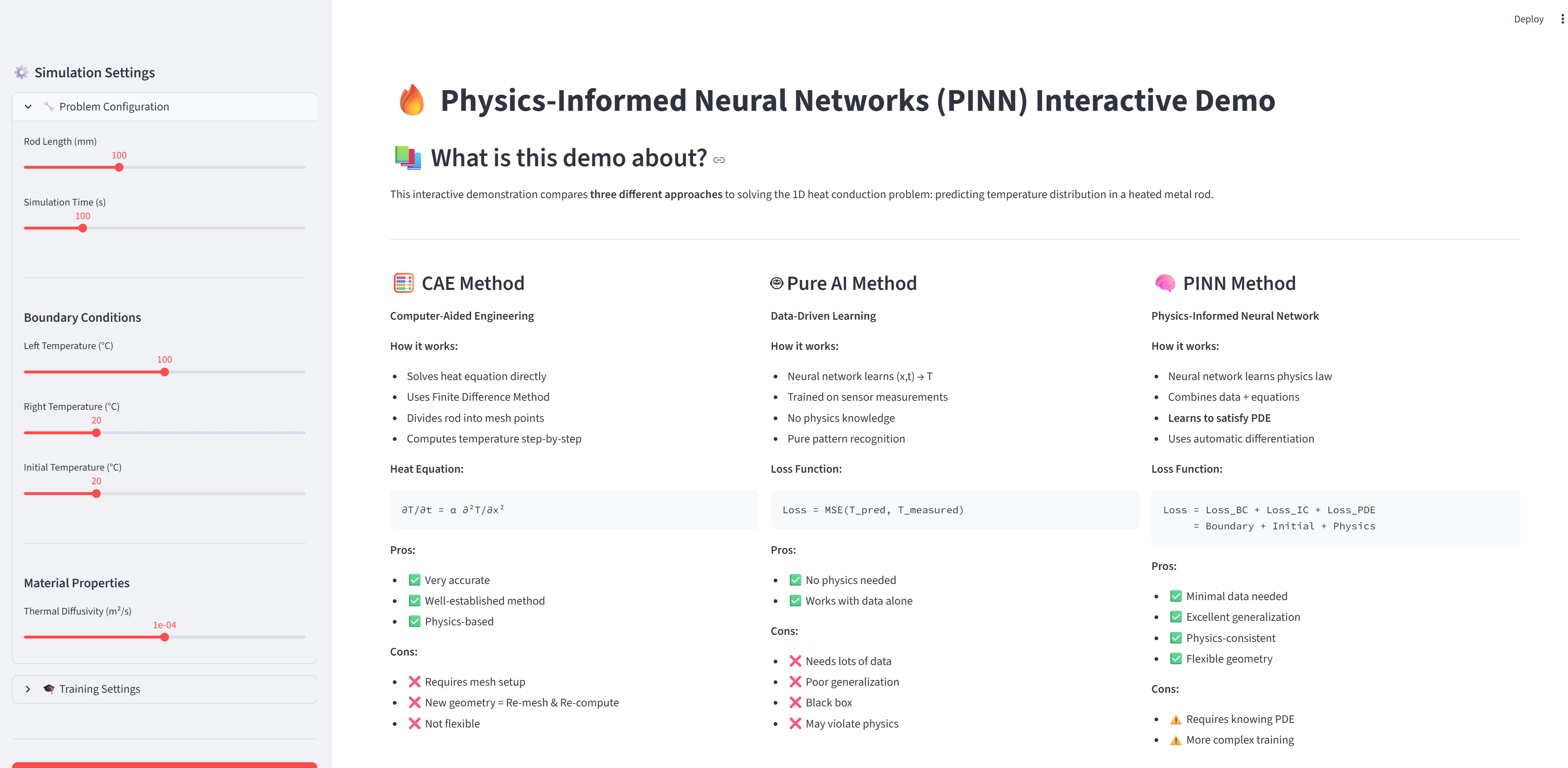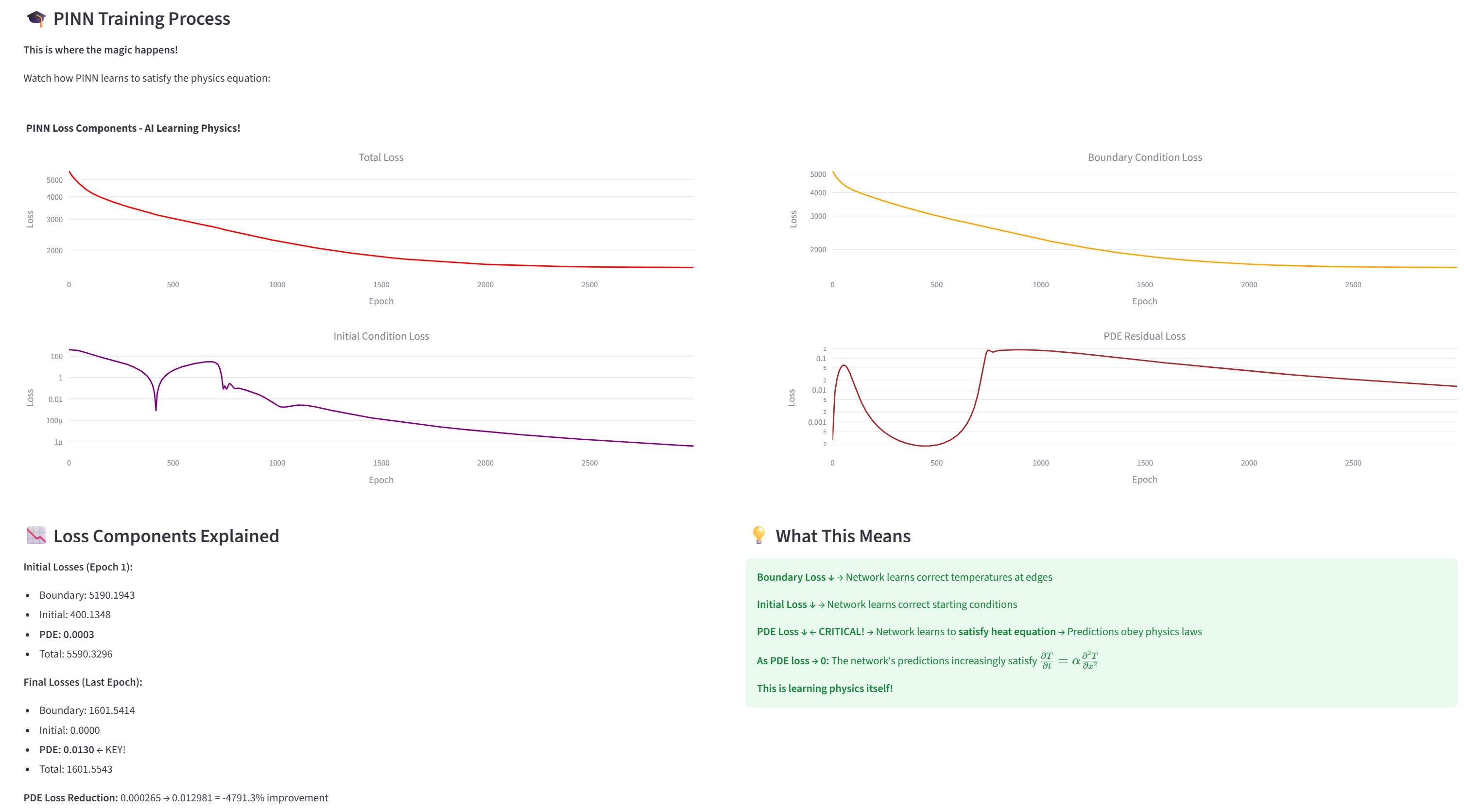 여기서 PDE Loss가 0.015라는 작은 값이 나왔다는 것은, 신경망의 예측이 열전도 방정식을 거의 완벽히 만족한다는 의미입니다. 즉, AI가 물리법칙을 학습했습니다!