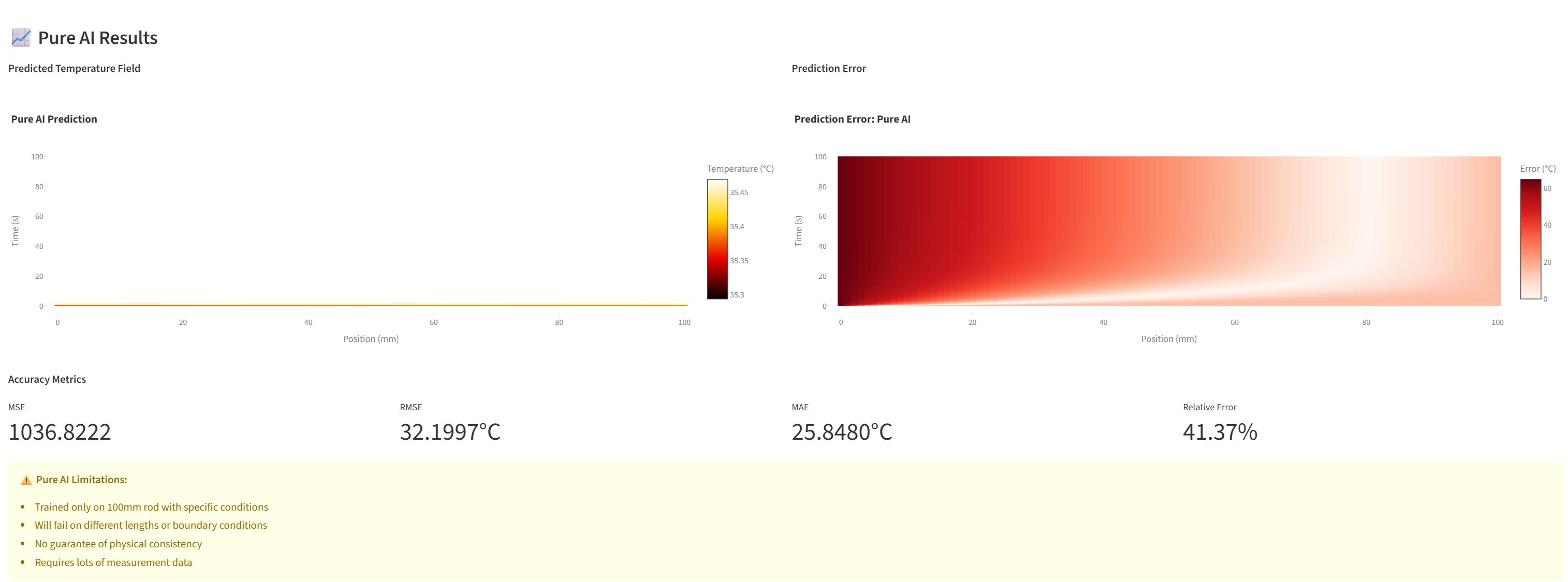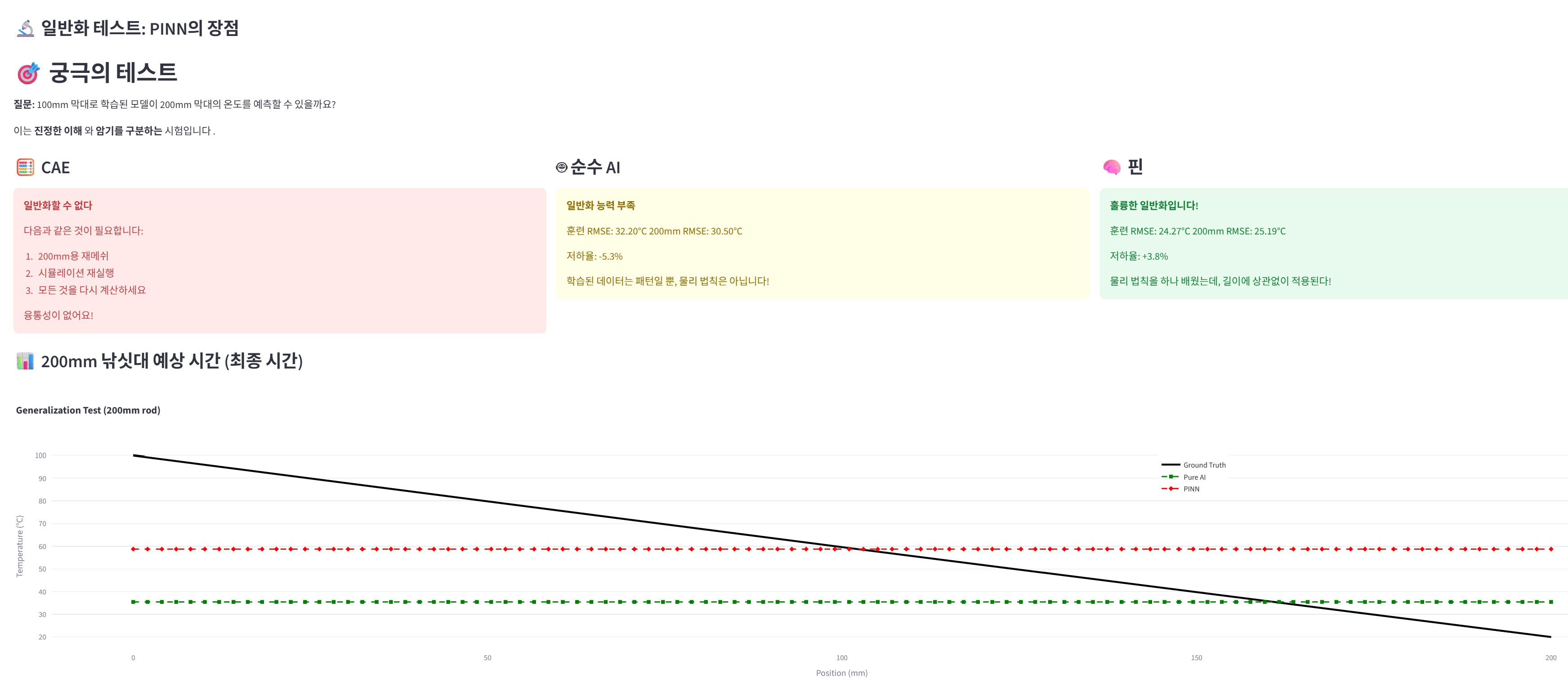 우리가 실험해본 결과, 순수 AI는 100mm 막대 데이터로 학습했을 때 100mm는 어느 정도 예측하지만, 200mm 막대를 예측하라고 하면 완전히 실패합니다. 왜일까요? AI는 데이터 패턴만 외웠을 뿐, 열이 어떻게 퍼지는지 물리 원리를 모르기 때문입니다.