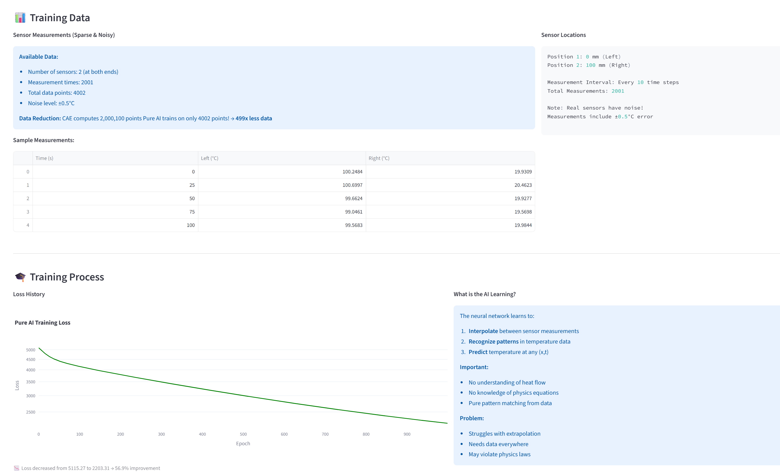 게다가 현실에서는 센서 데이터에 노이즈가 있고, 모든 시간대를 다 측정할 수도 없습니다. 이런 제한된 데이터로는 순수 AI의 성능이 더욱 떨어집니다.