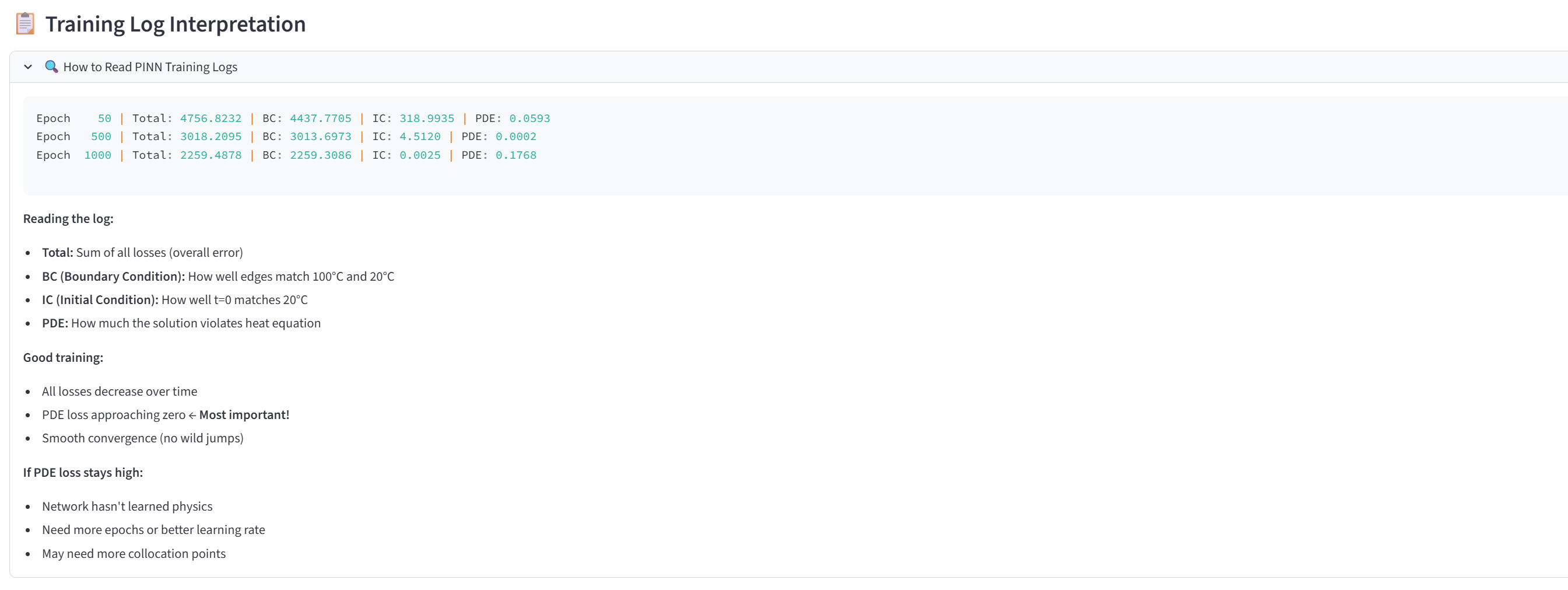 PINN을 학습시키면 이런 로그를 볼 수 있습니다:
