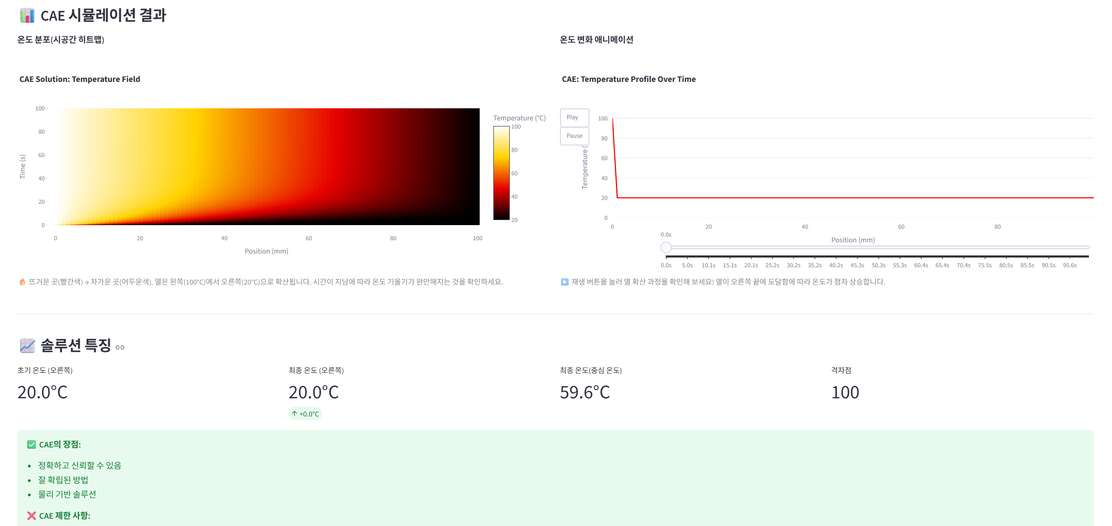 CAE는 열전도 방정식을 직접 계산합니다. 막대를 수백 개의 작은 구간으로 나누고(메쉬), 각 구간의 온도를 시간마다 계산하는 방식입니다. Ansys 같은 소프트웨어가 없어도, Finite Difference Method로 직접 구현할 수 있습니다.